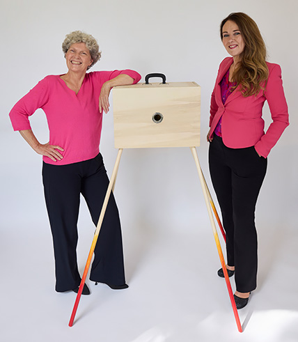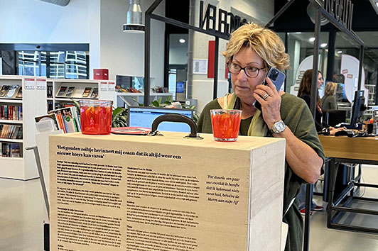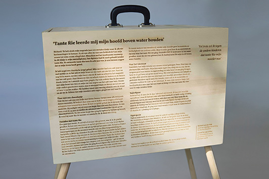 De verhalen van de geïnterviewden zijn letterlijk in hout gebrand – op de achterkant van de kofferkijkdozen. Aan elk handvat hangt een kofferlabel met daarop een polaroidfoto, een quote uit het interview en een QR-code. We kozen voor polaroidfoto’s, omdat elk exemplaar daarvan uniek en onvervangbaar is. Via de QR-code zijn de verhalen ook te beluisteren via een smartphone. De geïnterviewden leiden kort hun verhaal in en vervolgens worden ze voorgelezen door professionele voice-overs, zoals Linze Valk en Antoinette van den Steenhoven.